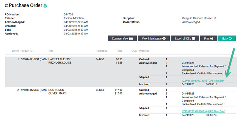 After locating the desired ISBN or purchase order, click on it to view the Purchase Order Detail page. If a supplier has updated the order with tracking information, it will display on the right while you are in Normal View (the default view).